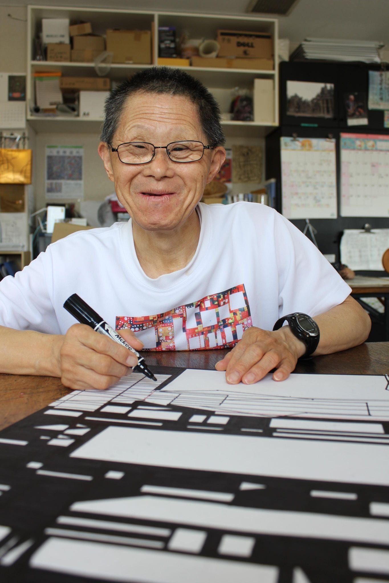 1956年岩手県北上市生まれ。子どもの頃から誰に習うことなく独創によって生み出してきた美しい色彩の幾何学模様は、建築物や自動車などを独自の表現で描写したもの。